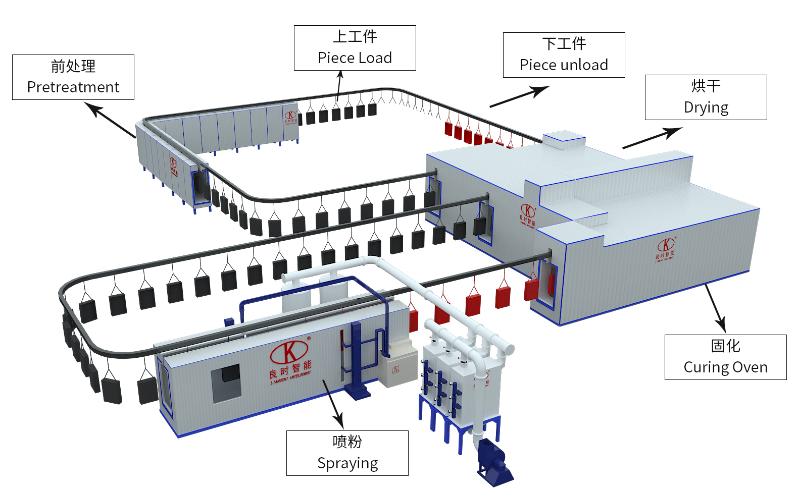 上件→前处理(喷抛丸 / 喷淋式)→烘干→粉末喷涂系统→固化→下件