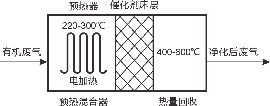 有机废气先经电加热预热至催化反应所需的温度,然后流经催化剂床层,在床层中有机物发生氧化反应生成无害的二氧化碳和水,并放出大量热量。