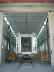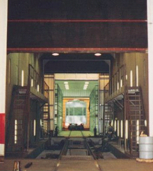 轨道车辆清理喷砂房 喷砂房尺寸:l x w x h = 30 x 6 x 6.5 m; 全地板机械式回收系统; 车辆下面安装地坑,进行喷丸操作; 4个人工工作平台, 2个压送式喷砂机; 侧壁上有照明装置, 两侧开门; 可选配电动工作平台; 可选配自动柔性升降门;