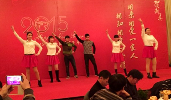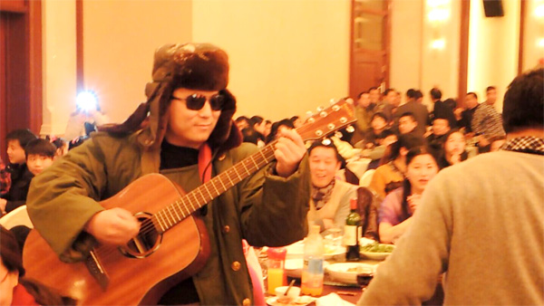 年会现场,公司领导以一身绿大衣、墨镜、军帽神秘形象出场,吉他弹奏演唱路演行乞,成功调动了年会气氛,颇受公司员工好评!公司领导们那么拼,其实只为了夺员工们一笑,而许多员工对于肯被"恶搞"的领导,都抱着赞许态度。"肯跟员工一起搞怪,是领导有活力的体现。一年到头为了公司辛勤劳动,看领导出出洋相,让大家笑笑,其实也是搞好企业文化的一个好方法!"