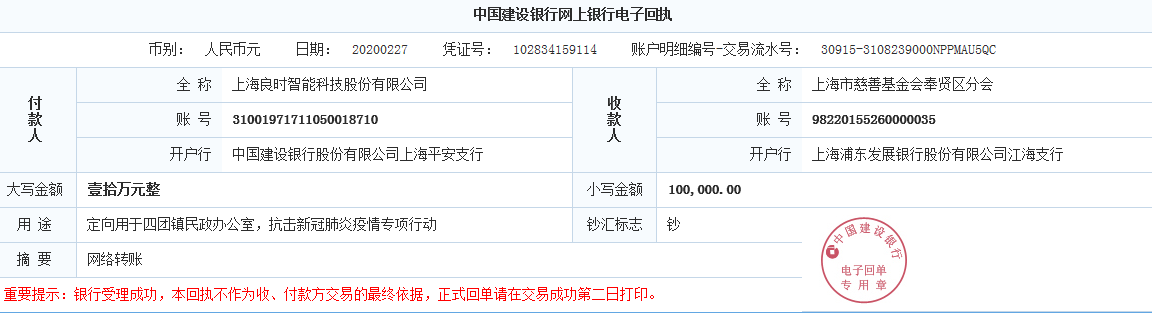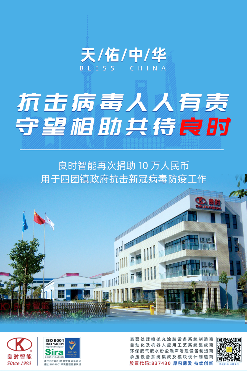2月27日,良时智能(股票代码:837430)经董事会决定,为了感谢奉贤区及四团镇两级领导对良时智能的支持与关爱,再次捐款10万元,用于四团镇镇政府抗击新冠病毒防疫工作。