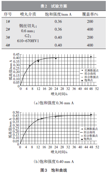 试验使用压缩空气式喷丸机,由于试验条件限制,无法验证喷丸介质属性(材质、大小、硬度)的影响,故试验中喷丸介质属性为常量,只验证饱和强度和覆盖率对喷丸后齿面粗糙度的影响,试验方案见表2。具体试验参数的确定过程如下:通过Almen试片试验绘制饱和曲线(图3),确定饱和 点,从而锁定压缩空气压力、钢丸流量、喷嘴移动速度、喷嘴距零件距离等设备参数。