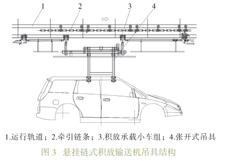 悬挂链式积放输送机能够利用有限的空间扩大运输及存储能力,该机型最大特点是实现在线存储功能。实现工位或工序间的物料存储,让工序间具有一定的弹性,实现小车间密集的停靠和积存,大大缩减了输送距离。此类型输送机用于规定的空间内,沿预定的轨迹运行,结构布局较灵活且占地面积小。积放悬挂链式输送机属于智能的输送系统,通过PLC集中控制实现自动输送、存储,从而实现了快节奏、高效率的现代化大规模生产。悬挂链式积放输送机吊具结构如图3所示。
