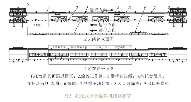 主要特点是智能化、灵活性较高、无油污、速度高,是目前车底密封线最较为先进的机械化智能输送设备,已在新能源汽车涂胶生产线上应用。涂胶线托盘式摩擦输送机线路布置如图5所示。
