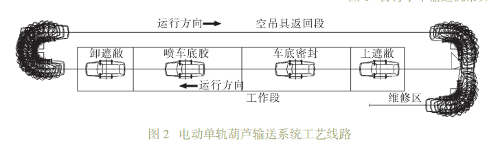 涂胶线以上输送方式中前3种输送方式空吊具返回均是水平返回,需要占用厂房空间,增大了涂装车间面积需求,影响整个涂装工艺线路布局。托盘式吊具输送方式空吊具垂直返回,节省了车间空间。