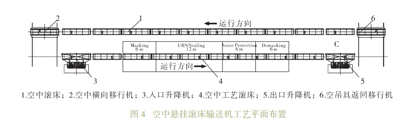 典型的涂胶线空中悬挂滚床输送机工艺平面布置如图4所示。