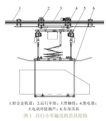 自行小车输送机也称电动单轨葫芦输送机(亦称微控电轨车、EMS),它是一种智能输送设备,电动单轨智能输送小车是高度体现了机械、电气于一体的现代化智能输送系统,体现了高度的智能和自动化,它具有智能控制、高度自动化、节能、操作灵活等特点,不仅在汽车生产线上被广泛应用,在其他行业也发挥着重要作用。自行小车输送机吊具结构如图1所示。