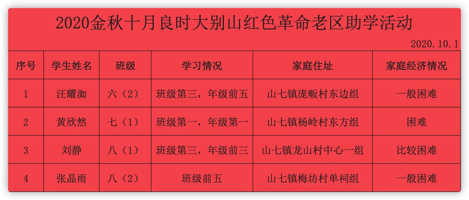 2020年注定是不平凡的一年,因为疫情等原因导致公司同事无法集体前往大别山革命老区进行助学活动。即使这样,上海良时智能(股票代码:837430 厚积薄发 持续创新)还是决定派遣良时青年突击队爱心特使在国庆假期期间前往大别山红色革命老区继续着良时国庆公益慈善活动!良时20多年坚持大别山红色老区助学之旅,创造价值,回报社会,初心不变!