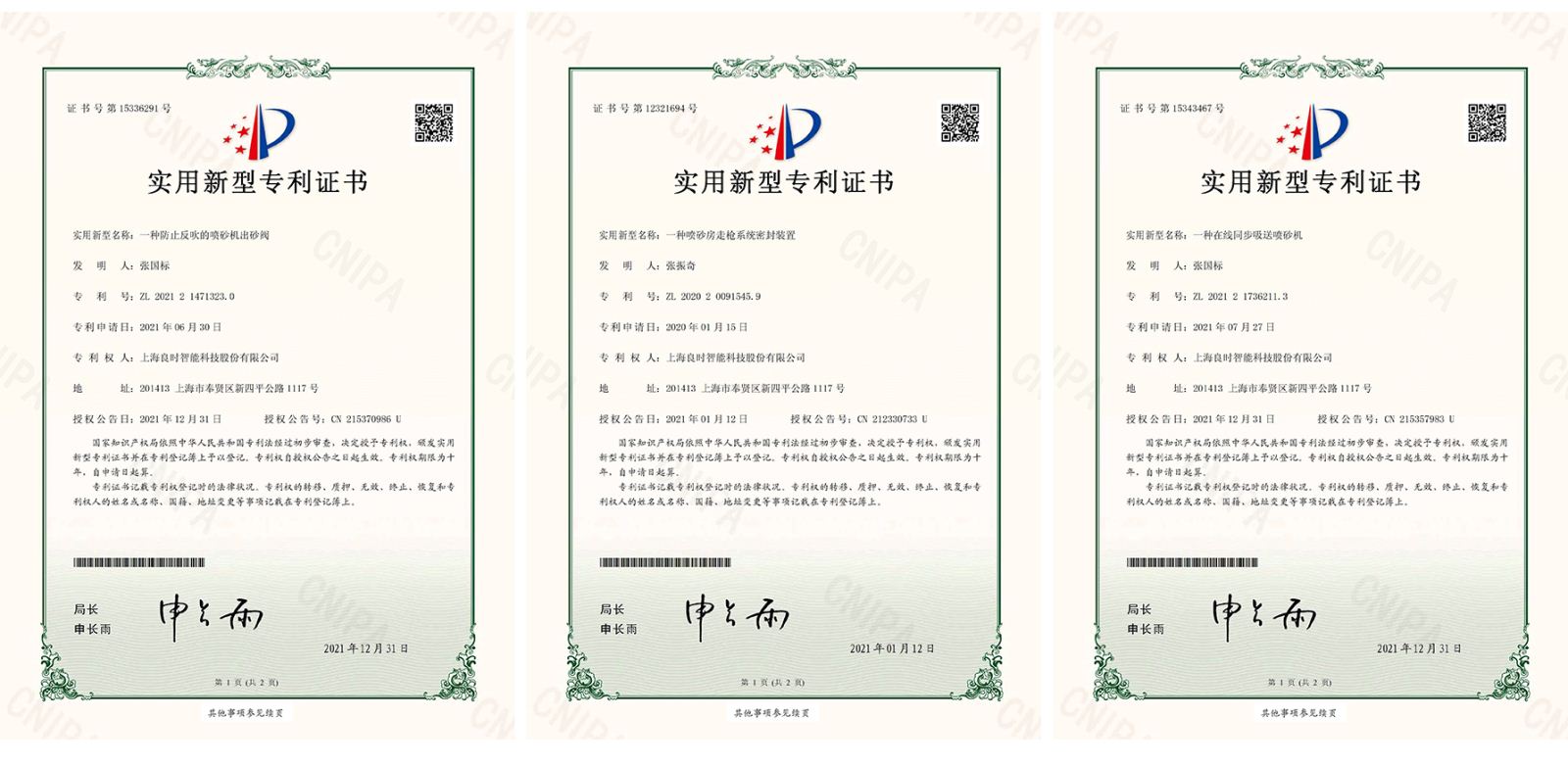 近日,上海良时智能(股票代码:837430)再次取得国家知识产权局授予的三项实用新型专利证书,专利名称分别为一种在线同步吸送喷砂机、一种集装箱喷砂机用快速截止阀、一种防止反吹的喷砂机出砂阀。
