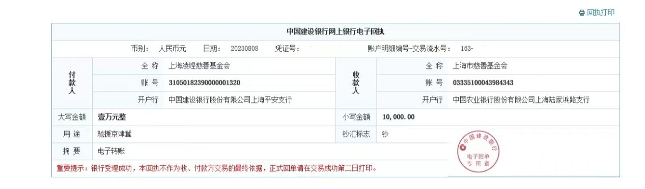洪水无情人有情,大灾面前有大爱!河北多地的灾情牵动了全国人民的心。为了帮助受灾群众尽早度过难关、重建美好家园,上海凌铿慈善基金会向京津冀等地区水灾专项行动捐赠一万元,用于支持当地救灾救援和灾后重建工作。
