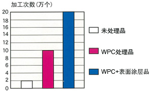 ★★ WPC处理的寿命延长效果示例 HSSCO钻子:5倍以上 HSSE蒸汽氧化处理丝锥:4倍 超硬分段式抛光铰刀:3倍 SKH51拉刀:4倍 超硬立铣前处理后TiCN涂层:7倍以上 超硬刀片:2倍以上