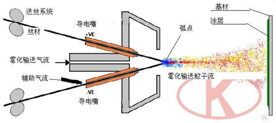 图:双气流再雾化输送模式电弧融射喷涂原理